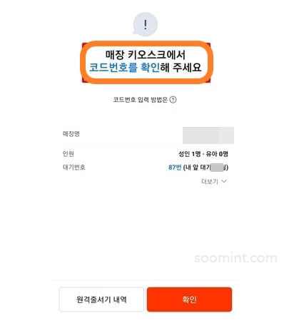 기계화면 왼쪽하단 코드번호:000000 가게마다 특정 코드번호가 모니터에 적혀 있습니다. 대기 확정 코드를 입력하신 다음 카톡 알람의 첫 번째 내 순서 확인하기를 선택하시면 현재 내가 몇 번째 인지 예약한 인원 등 을 확인 하실 수 있습니다.